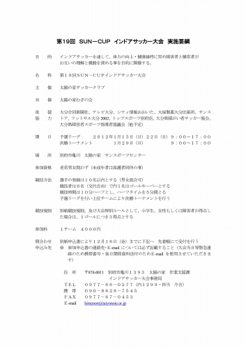 | 第19回SUN−CUPインドアサッカー大会のお知らせ(2011/12/2) 第19回SUN−CUPインドアサッカー大会が来年1月に行われます。 この大会は、太陽の家サッカークラブが主催するもので、大分県障がい者サッカー協会は後援しています。 詳しくは「大会実施要綱」をご覧ください。PDFファイルです。 ![]() 参加を希望されるチームは、下記ファイルをダウンロードし、申込書を大会実施要綱にあるように「太陽の家健康推進課の大会事務局」まで送付してください。 SUN−CUPインドアサッカー大会参加申込書wordファイルです。 期日、会場などは次のとおりです。 <期日> 2012年1月15日、22日、29日 <会場> 太陽の家 サンスポーツセンター (別府市大字内竈1393−2) <申し込み> 2011年12月16日までに大会事務局まで申し込みください。 多くの方の参加をお待ちしています。 |