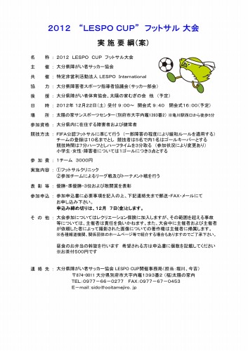 | 2012LESPO CUPフットサル大会のお知らせ(2012/11/17) 2012LESPO CUPフットサル大会を12月22日(土)に行います。 この大会は、今年で4回目となり、OFAD発足に関係する記念すべき大会です。 今年から主催が大分県障がい者サッカー協会となり、特定非営利活動法人 LESPO Internationalは共催となりました。、また、大分県障害者スポーツ指導者協議会(サッカー部会)が協力していただくことになりました。 参加を希望されるチームは、下記ファイルをダウンロードし、申込書を大分県障がい者サッカー協会 LESPO CUP開催事務局(担当:堀川、今吉)まで送付してください。 詳しくは、ファイルの中にある実施要綱をご覧ください。 2012 “LESPO CUP”フットサル大会実施要綱および申込書 ![]() 日程、会場は次のとおりです。 <日程> 受付 9:00〜 開会式 9:40 閉会式16:00(予定) <会場> 太陽の家 サンスポーツセンター (別府市大字内竈1393−2) 多くの方の参加をお待ちしています。 |