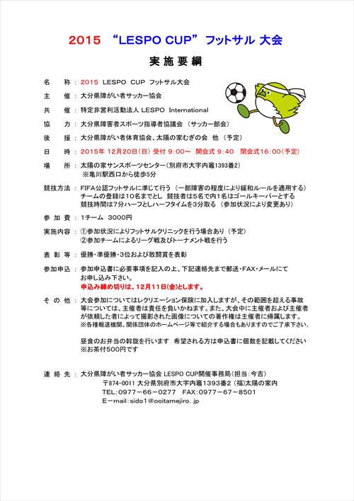 | 2015LESPO CUPフットサル大会のお知らせ(2015/11/8) 2015LESPO CUPフットサル大会を12月20日(日)に行います。 この大会は、今年で7回目となり、OFAD発足に関係する記念すべき大会です。 主催は大分県障がい者サッカー協会で、特定非営利活動法人 LESPO Internationalが共催しています。また、大分県障害者スポーツ指導者協議会(サッカー部会)に協力していただいています。 参加を希望されるチームは、下記ファイルをダウンロードし、申込書を大分県障がい者サッカー協会 LESPO CUP開催事務局(担当:今吉)まで送付してください。 詳しくは、ファイルの中にある実施要綱をご覧ください。 2015 “LESPO CUP”フットサル大会実施要綱 ![]() 参加の申し込みは下記リンクからエクセルファイルをダウンロードし、記載の申し込み先にお願いします。 レスポカップ申込書 日程、会場は次のとおりです。 <日程> 受付 9:00〜 開会式 9:40 閉会式16:00(予定) <会場> 太陽の家 サンスポーツセンター (別府市大字内竈1393−2) 多くの方の参加をお待ちしています。 |