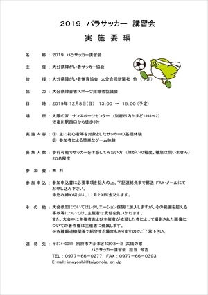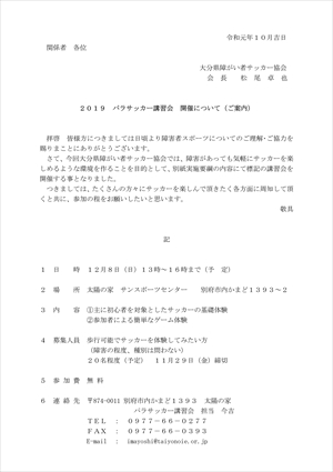 | 2019パラサッカー講習会開催について(ご案内) 日頃より障害者スポーツについてのご理解・ご協力を賜りまことにありがとうございます。 さて、今回大分県障がい者サッカー協会では、障がいがあっても気軽にサッカーを楽しめるような環境を作ることを目的として、別紙実施要綱の内容にて標記の講習会を開催する事となりました。 つきましては、たくさんの方々にサッカーを楽しんで頂きたく各方面に周知して頂くと共に、参加の程をお願いしたいと思います。 1 日 時 12月8日(日)13時〜16時まで(予 定) 2 場 所 太陽の家 サンスポーツセンター 別府市内かまど1393〜2 3 内 容 @主に初心者を対象としたサッカーの基礎体験 A参加者による簡単なゲーム体験 4 募集人員 歩行可能でサッカーを体験してみたい方(障がいの程度、種別は問いません) 20名程度(予定) 11月29日(金)締切 5 参 加 費 無 料 6 連 絡 先 〒874-0011 別府市内かまど1393 太陽の家 パラサッカー講習会 担当 今吉 TEL : 0977−66−0277 FAX : 0977−66−0393 参加を希望する方は以下の案内、実施要綱をご覧になり、申込書をFAXまたは電子メールにて担当へ送付してください。 1 2019パラサッカー講習会開催について(ご案内) PDF(46KB) 2 実施要綱 PDF(881KB) 3 申込書 PDF(36KB) 申込書XLS(34KB) ![]() ![]() |