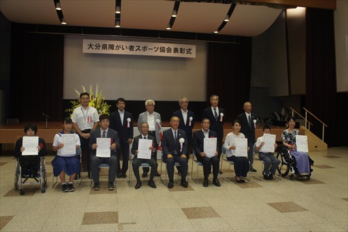 | 令和2年度大分県障がい者スポーツ協会功労賞受賞のお知らせ(2020/8/4) 8月4日(火)に大分県庁正庁ホールにて、令和2年度大分県スポ―ツ協会の表彰式が行われました。 大分県障がい者スポーツ協会では、大分県内の障がい者スポーツの一層の振興を図ることを目的として、長きにわたり障がい者スポーツの発展に功労のあった個人や団体、また障がい者スポーツ大会において優秀な成績を収められた選手に対して表彰を行っています。 今年度は知的委員会所属の「サカたの」から平野さん(大分県障がい者サッカー協会事務局次長)が個人として「功労賞」を受賞されました。おめでとうございます。 表彰状にはこのように書かれていました。 「10年以上にわたり本県の障がい者スポーツの発展に特に顕著な貢献をされました。よってその功績を讃え、ここに表彰いたします。」 当日の表彰の様子は以下のとおりです。 ![]() ![]() |