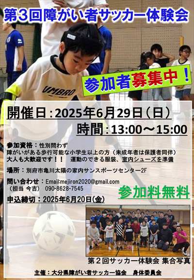 | 第3回障がい者サッカー体験会開催について(ご案内)(2025.4.21) 本協会は、主に大分県下にて広く障がい者サッカーの普及活動に努めています。 今回は、その活動の一環として日頃スポーツ活動を体験する機会が少ない障がい者の方々にサッカーを体験していただきたく下記のとおり開催します。 今回で3回目の開催となります。初めての方も2度目の方もご都合を合わせ、参加してください。 お待ちしています。 1 名称 第3回障がい者サッカー体験会 2 主催 大分県障がい者サッカー協会 身体委員会 3 後援 大分合同新聞社、大分県パラスポーツ指導者協議会、他予定 4 協力 FC太陽フリーダムス 5 日時 2025年6月29日(日)13時〜15時 6 場所 別府市亀川太陽の家内 サンスポーツセンター2F 7 参加資格 障がいのある歩行可能な小学生以上の方 (男女問わず 未成年者は保護者同伴) 8 参加費 無料 9 準備用具 運動の出来る服装、室内シューズ 10 申込締切 2025年6月23日(月) 11 申込み 下記問合せ先にメールおよび携帯にて受付 問合せ先〒874−0011 別府市内かまど1393番地2 太陽の家 Email : mejiron2020@gmail.com TEL 090−8628−7545 (担当 今吉) ![]() 体験会チラシ(PDF:498KB) ![]() 開催要項(PDF:30KB) |